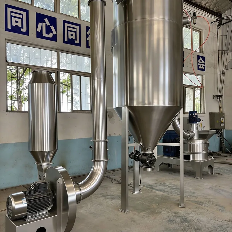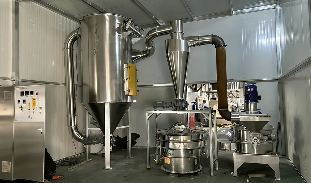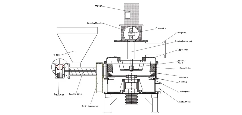 Det specifika bearbetningsflödet är enkelt: först, mata in det grova pulverråmaterialet med en partikelstorlek på högst 10 mm in i matningsmagasinet och transportera det sedan till krosskammaren med konstant hastighet genom en matare med variabel frekvens; Slipskivan i slipkammaren roterar med hög hastighet, driver sliphammaren och slipvalsen att löpa synkront med hög hastighet, genererar stark centrifugalkraft och kastar det grova pulverråmaterialet in i malkammarens innervägg; Under inverkan av centrifugalkraften utsätts råmaterial för svåra kollisioner, skjuvning och friktion med slitstarka foderplattor, krosshammare och krossrullar, vilket slutför preliminär krossning; Efter initial krossning kommer materialet att föras in i klassificeringskammaren av det negativa tryckluftflödet som genereras av den inducerade dragfläkten. Klassificeringshjulet i klassificeringskammaren roterar med hög hastighet för att exakt klassificera efter partikelstorleken. Det ultrafina pulvret som uppfyller kraven (partikelstorleken kan justeras efter behov) kommer att föras in i uppsamlaren av luftflödet för att slutföra insamlingen; Grovt pulver som inte uppfyller partikelstorlekskraven kommer att fångas upp av sorteringshjulet och skickas tillbaka till krosskammaren för sekundär krossning tills det når den specificerade partikelstorleksstandarden, vilket säkerställer enhetligheten hos det färdiga pulvret.