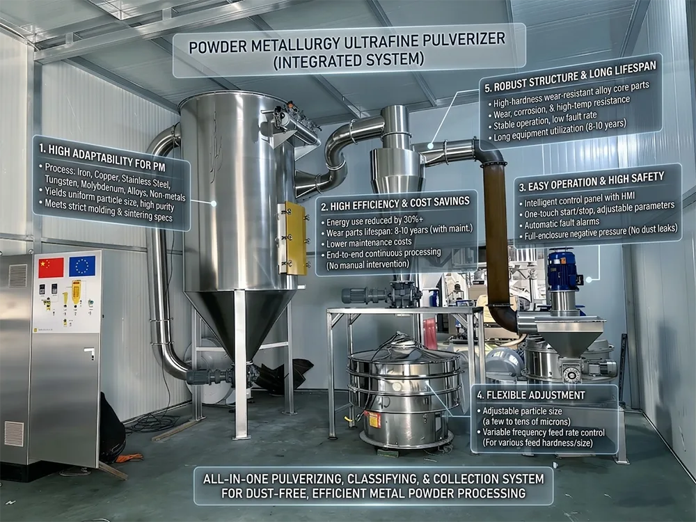 Grundprincipen för den pulvermetallurgiska ultrafina pulverisatorn är att gradvis krossa grova pulverråmaterial till ultrafint pulver som uppfyller kraven för pulvermetallurgiproduktion genom den synergistiska effekten av höghastighetsslag, skjuvning och friktion. Hela bearbetningsprocessen genomförs i en sluten undertrycksmiljö, vilket är både miljövänligt och säkerställer bearbetningsnoggrannhet.