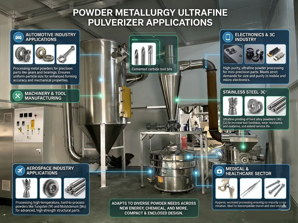 Den pulvermetallurgiska ultrafina pulverisatorn används huvudsakligen för ultrafin bearbetning av råmaterial i hela pulvermetallurgiindustrin och kan anpassa sig till krossningsbehandlingen av olika metall-, legerings- och icke-metallpulver. Det används i stor utsträckning inom flera områden som fordon, maskiner, elektronik, flyg, medicin och verktygstillverkning. De specifika tillämpningsscenarierna är följande: